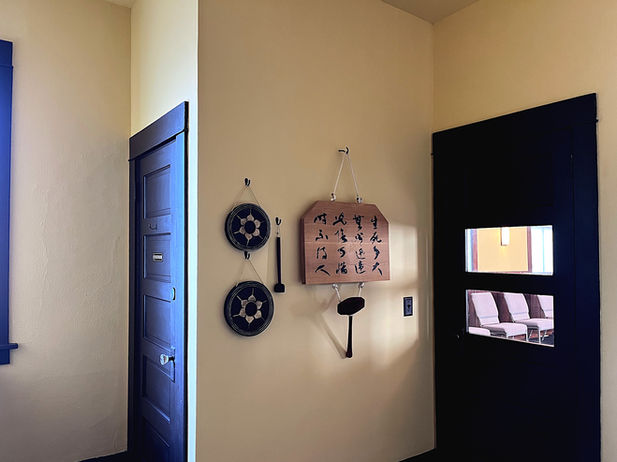 We enter the zendo from the downstairs entrance of the temple. Inside is a place where you can remove your shoes and leave your belongings. The downstairs door is locked during zazen. So items are safe. If you arrive late, you may enter through the main entry upstairs. If this is your first time, you'll be met by a host who will show you around and offer meditation instruction. Whenever entering or existing the zendo, it is traditional to bow (hands palm to palm in gassho) first to the icon of Kanon, just inside the zendo door to the right. Then proceed to your row. Bow at the head of the row. Walk to the cushion, bench or chair you would like to sit at, offer a standing bow to the altar and then to the community. Take whatever seated position is most comfortable and supportive. Traditionally, we are all in seiza (on our knees) for the opening tea service. All of this indicates the seriousness with which you approach your practice and prepare for zazen. While entering the zendo with seriousness, one is encouraged not to become glum. Rather, we can have a light and graceful attitude while coming to practice.